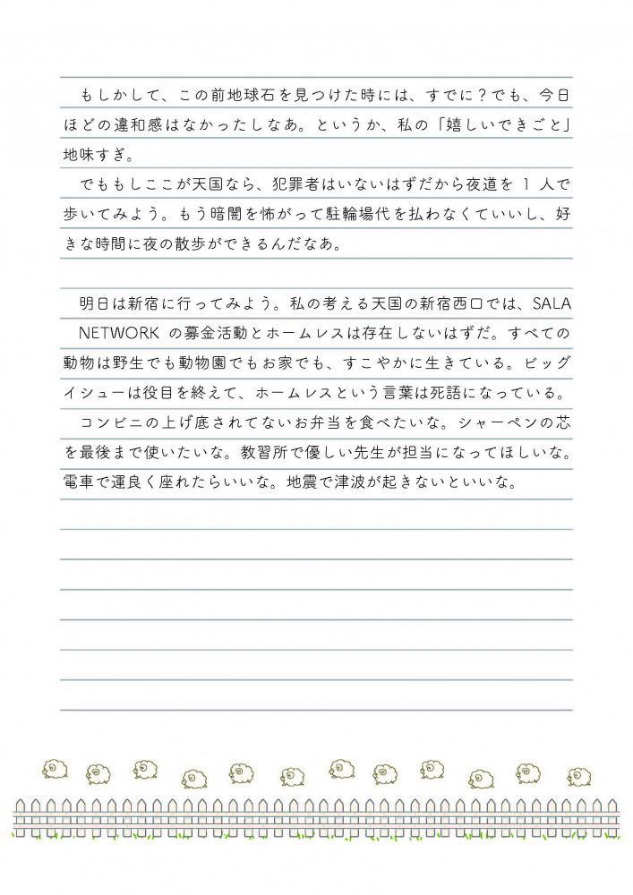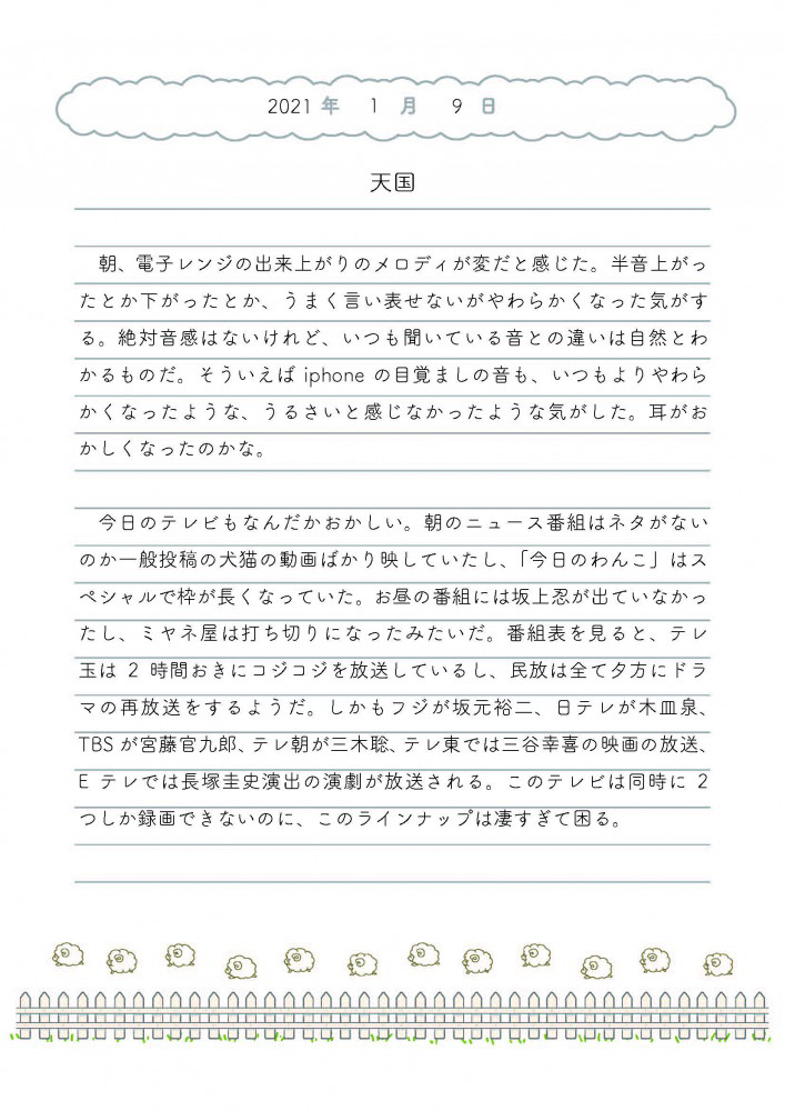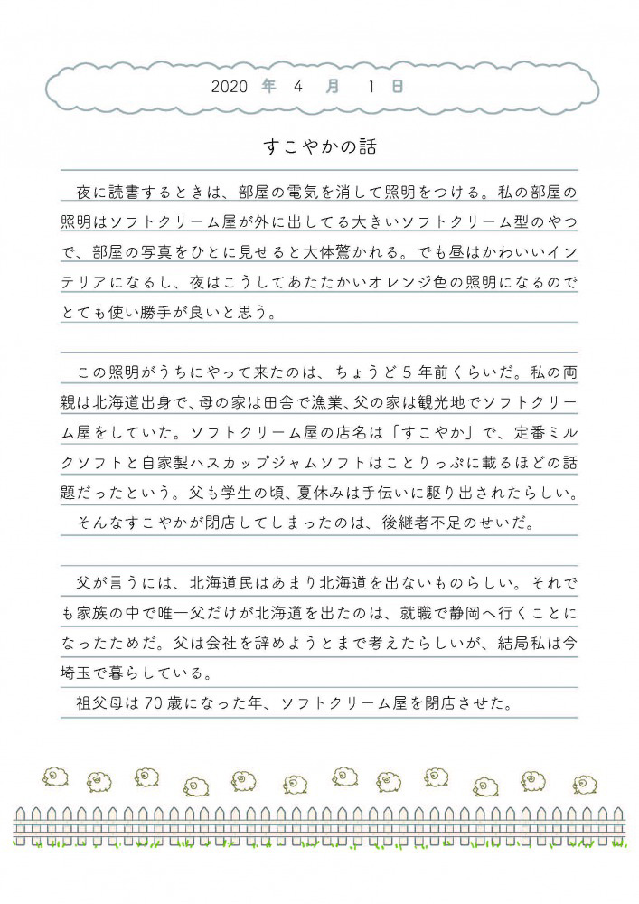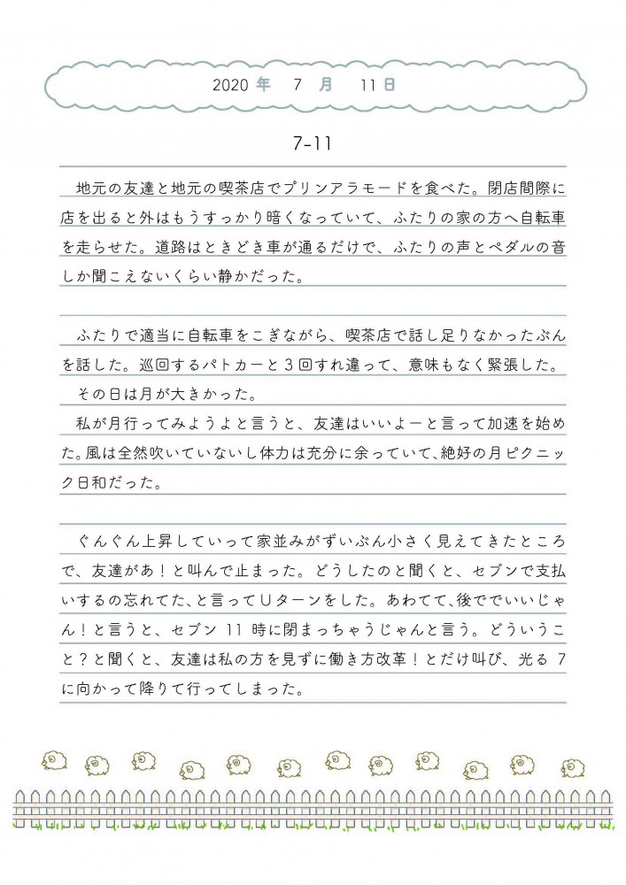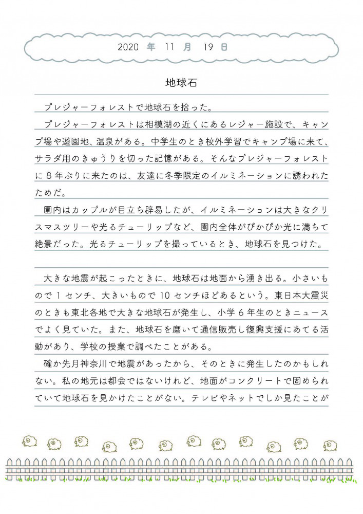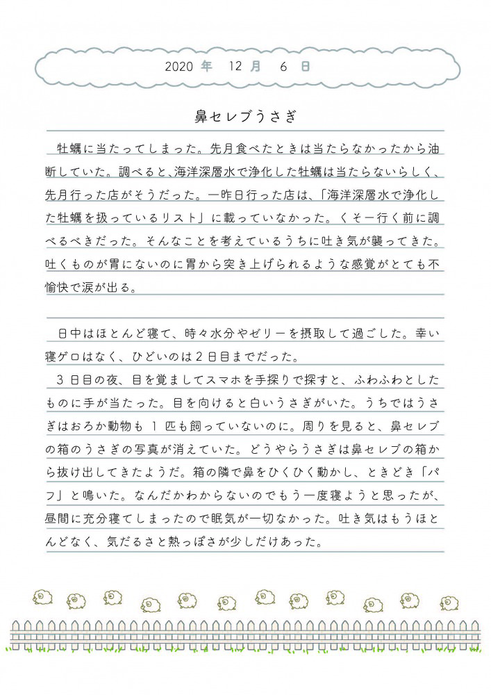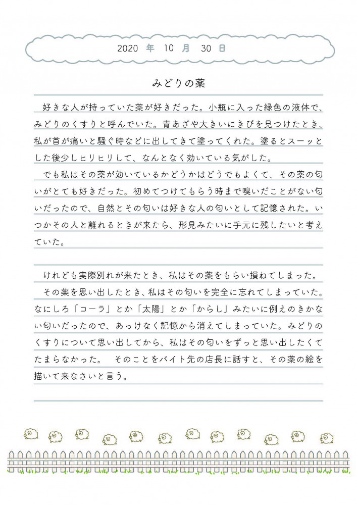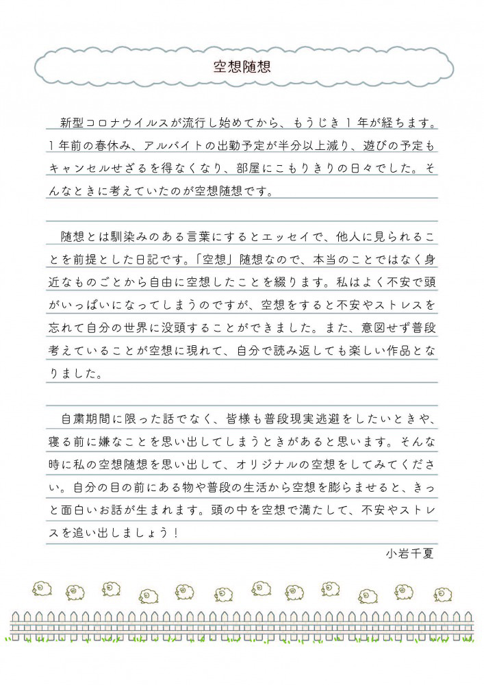 コロナ禍の自粛期間中、感染の不安や生活の制限から鬱のようになった方がいると耳にしました。現実逃避をしたい時や寝る前に嫌なことを思い出してしまう時など、この空想随想を思い出して空想してみてほしいです。自分の目の前にある物や普段の生活から空想を膨らませると、きっと楽しいお話が生まれます。頭の中を空想で満たして、不安やストレスを追い出しましょう。