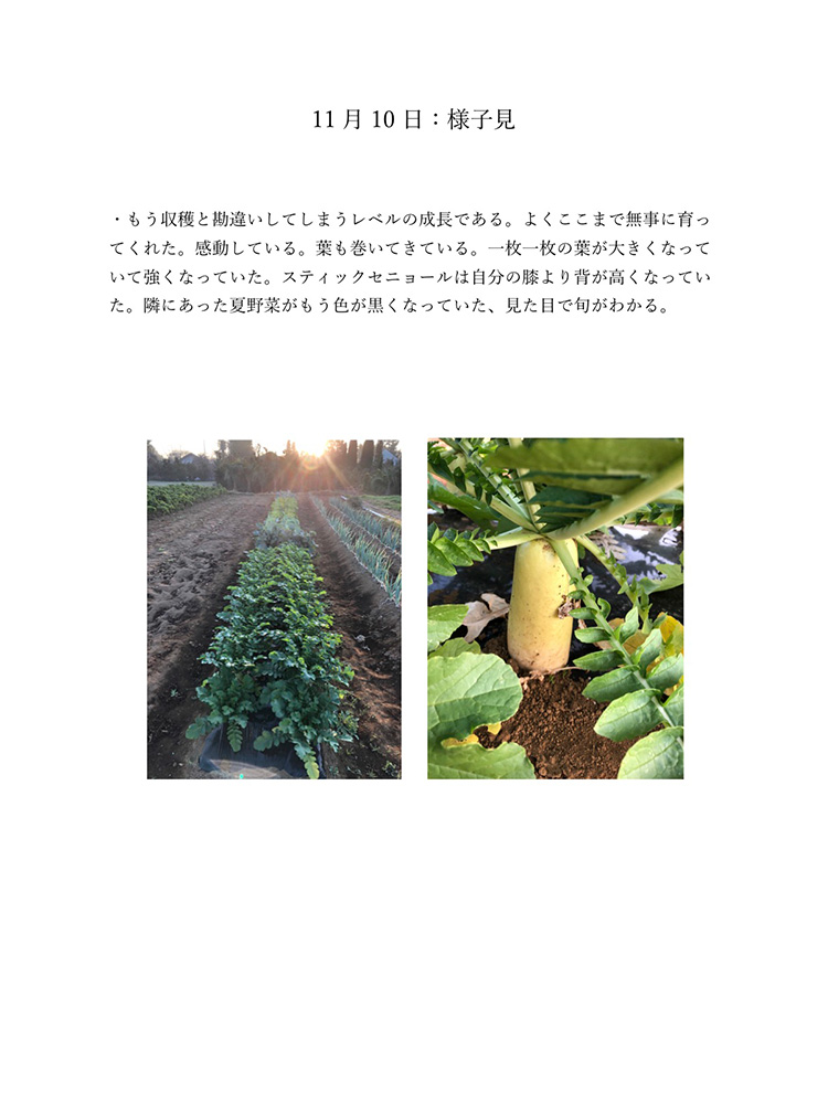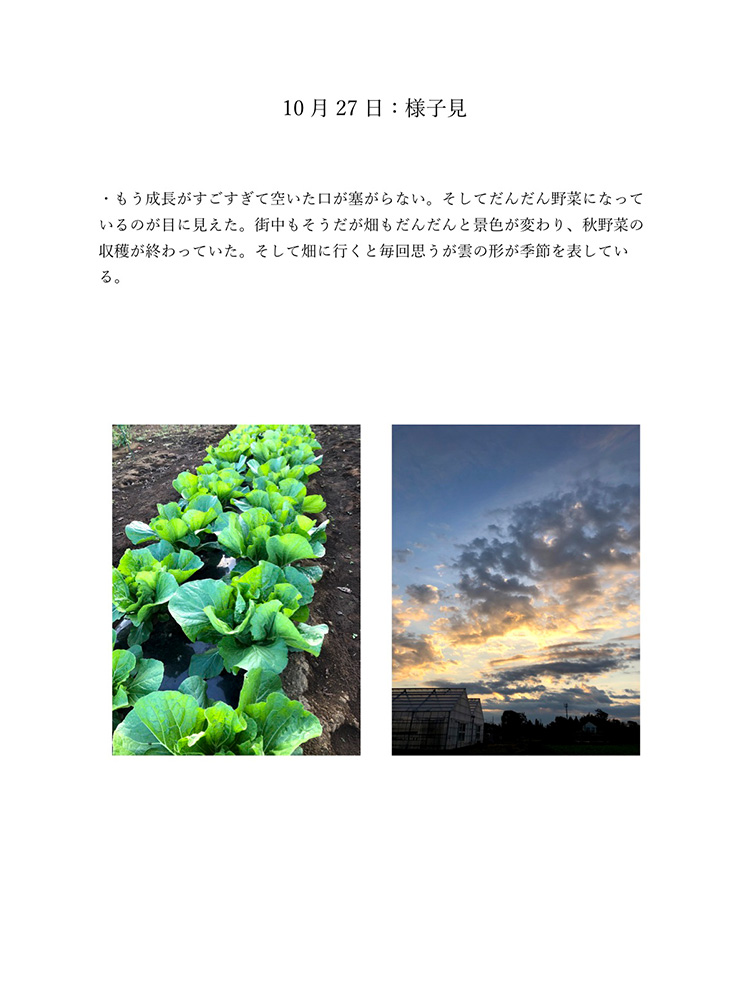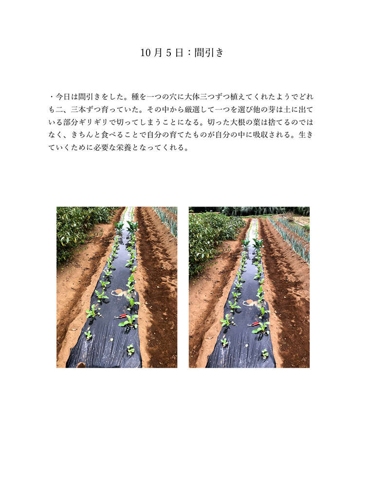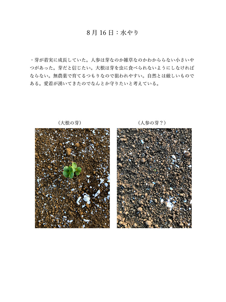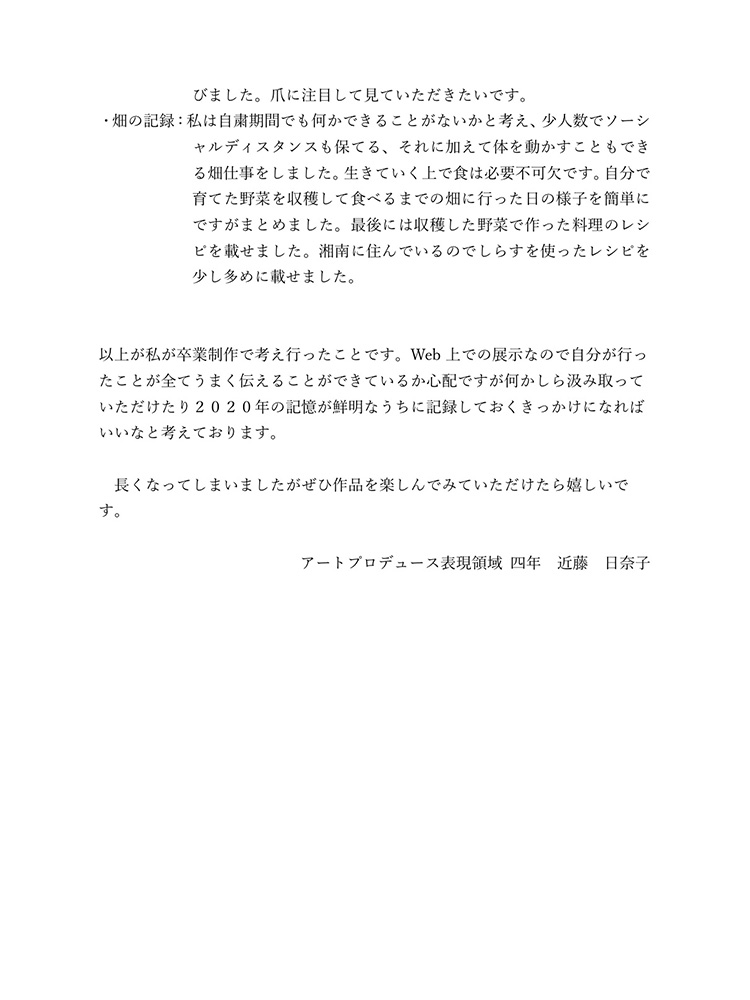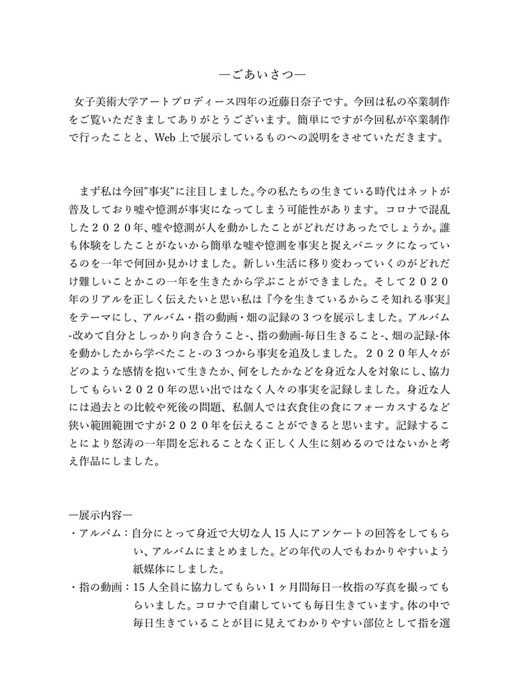 今のコロナの状況は自分たちが直面しているからわかることです。もし今後30年、40年こんな状況が続いたとしたら2020年のことは記憶の中で薄れていってしまい、この先話していても記憶は曖昧なものできっと、矛盾が生じてしまうと考えました。矛盾や記憶違いを生まないように今年の記録をしっかり残しておけば自分たちの思っていたことや体験を鮮明に思い出せます。今生きているからこそ知れる事実をテーマにし、2020年人々がどのような感情を抱いて生きたか、何をしたかなどを身近な人を対象にし、協力してもらい2020年の思い出ではなく人々の事実を記録しました。身近な人には過去との比較や死後の問題、私個人では衣食住の食にフォーカスするなど狭い範囲範囲ですが今年考えたことの事実として伝えることができると思います。事実を記録することにより2020年という怒涛の1年間を忘れることなく正しく人生に刻めるのではないかと考え作品にしました。