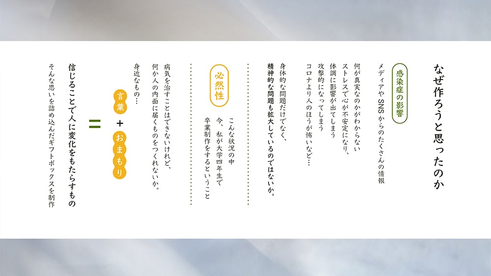 新型コロナウイルスの影響による⾃粛期間中、メディアやSNSからたくさんの情報が錯綜し、何が真実なのかがわからなくなったり、ストレスで⼼が不安定になり体調に影響が出てしまう⼈、攻撃的になってしまう⼈、さらにコロナより⼈のほうが怖いという⾔葉まで⽿にする様になりました。感染病による影響は⾝体的な問題だけでなく、精神的な問題も同じくらい拡⼤していると感じ、そんな状況の中で今を⽣きているということ、私が今⼤学四年⽣で卒業制作をするということに何か必然性があるのではと思い、病気を治すことはできないけれど、何か⼈の内⾯に届くようなものを卒業制作の作品として落とし込めないかと考えました。そこで⾃分の⾝近にある「⾔葉」と「おまもり」をキーワードに、この⼆つに共通すること「信じることで⼈に変化をもたらすもの」を作ろうと決め、思いを詰め込んだギフトボックスという形を選びました。