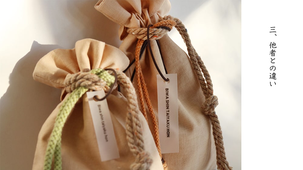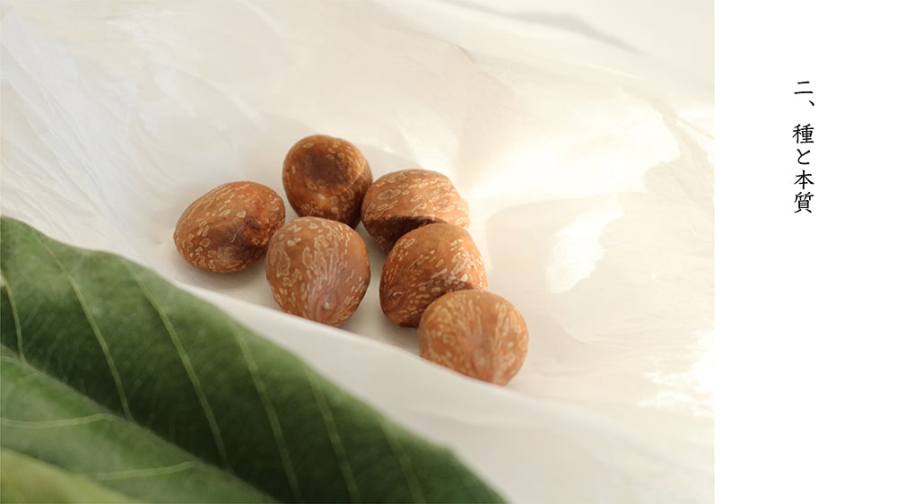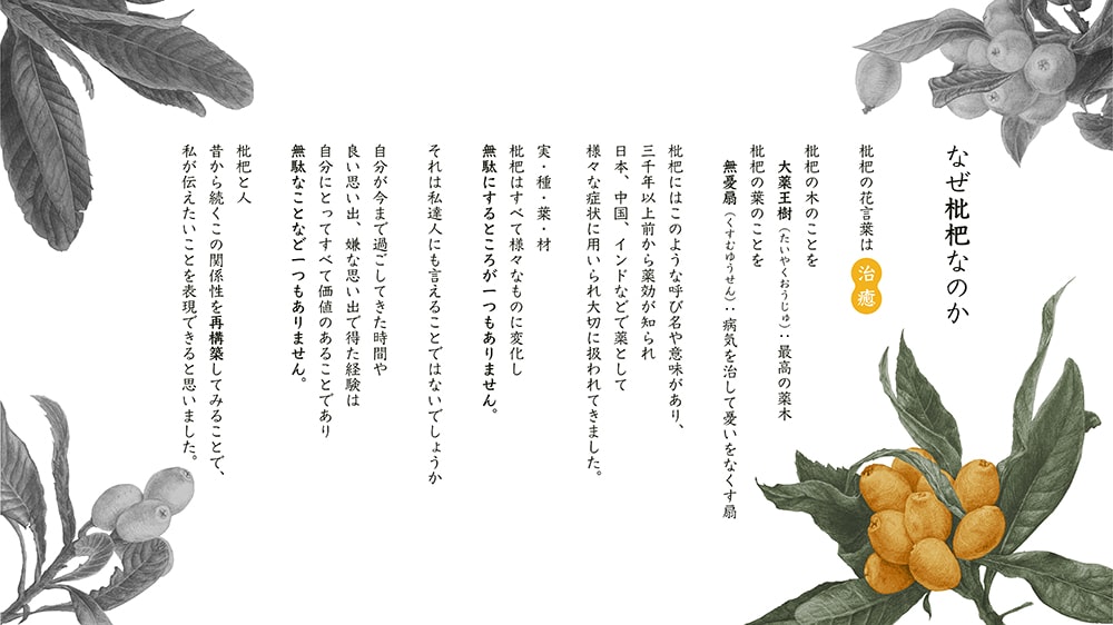枇杷にはこのような意味や呼び名があり、約3000年以上前から薬効が知られ、⼤切に扱われてきました。実・種・葉・材、枇杷はすべて様々なものに変化し、無駄にするところが⼀つもありません。