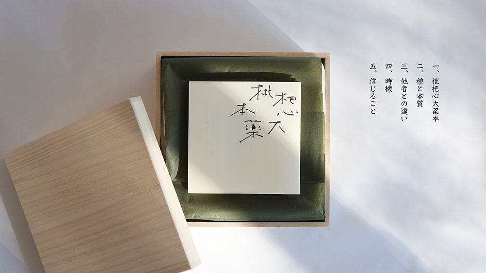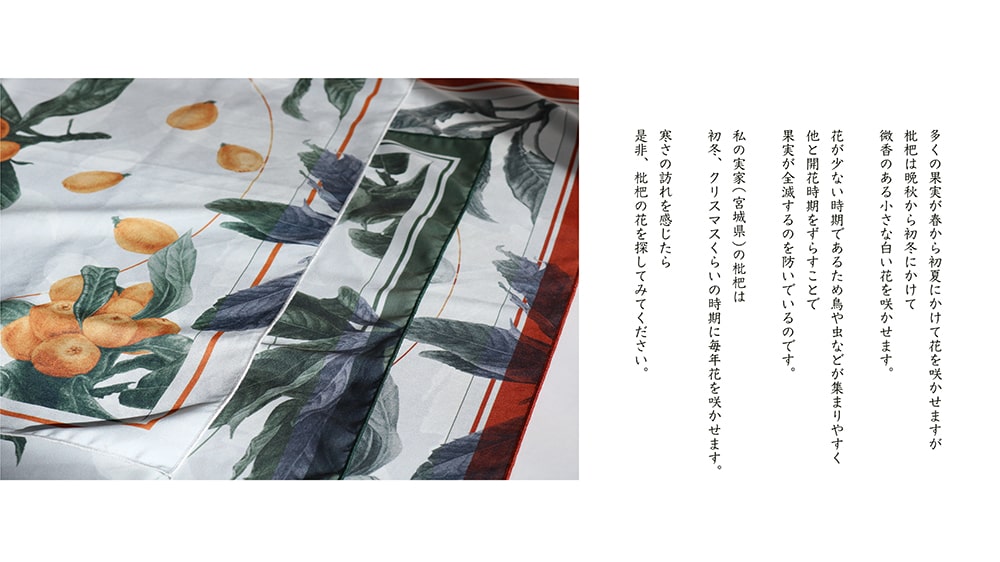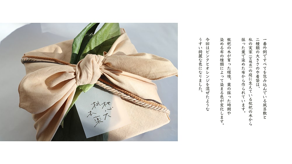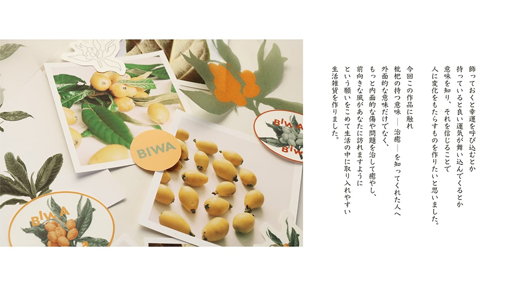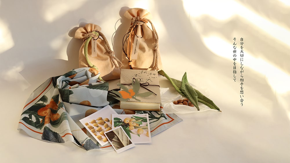 昔から続くこの関係性を再構築し、この作品に触れて枇杷の持つ意味「治癒」を知ってくれた⼈へ、「外⾯的な意味だけでなく、もっと内⾯的な傷や問題を治して癒やし、前向きな⾵があなたに訪れますように」という願いを込めて、⽣活の中に取り⼊れやすい⽣活雑貨を中⼼としたギフトボックスを作りました。